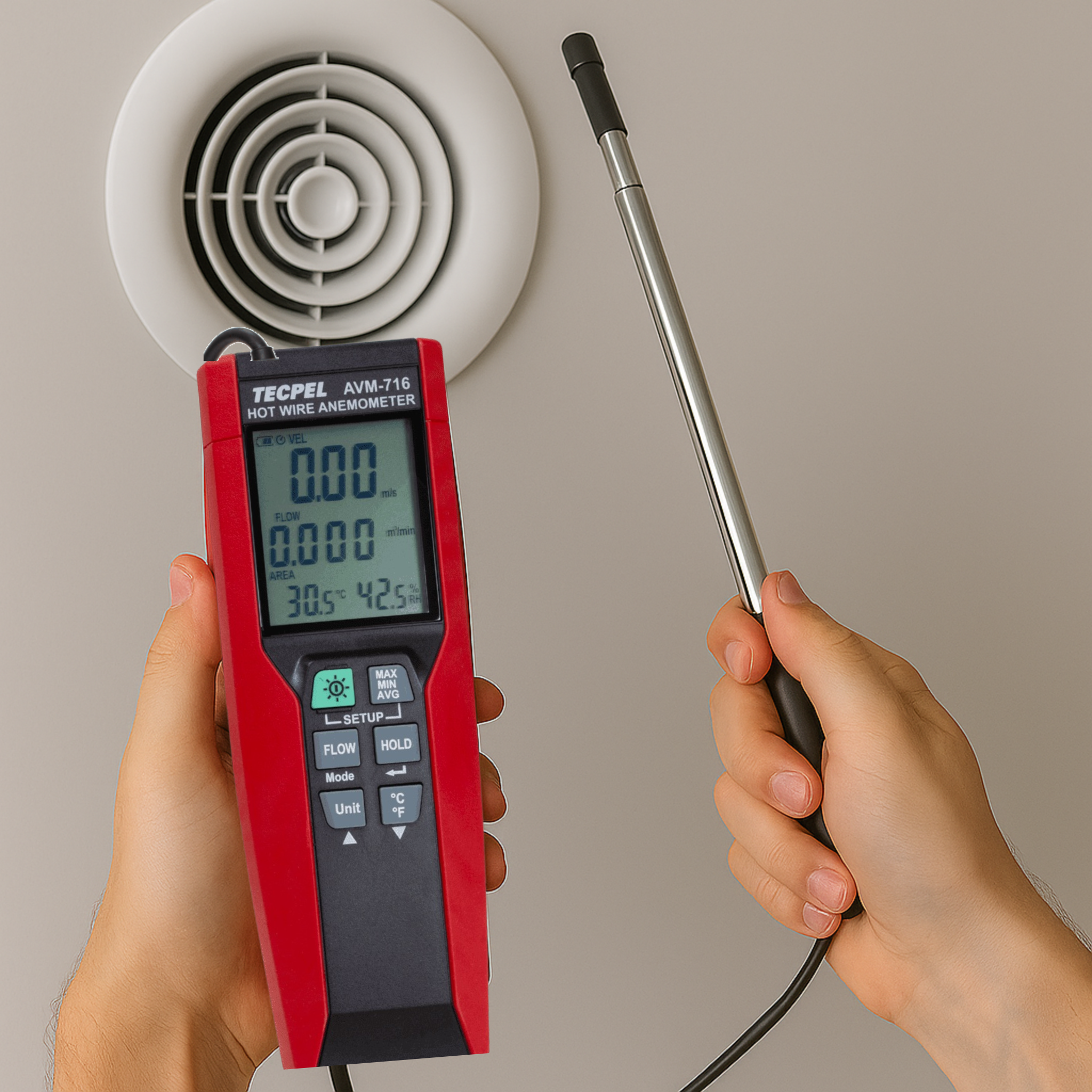 AVM-716 熱線風速計適合用於環境與特殊應用測試,包含暖通空調、汽車空調及氣象觀測等領域。設備支援多種測量單位,並具備快速的響應時間。可同時量測溫濕度、風速、風量。