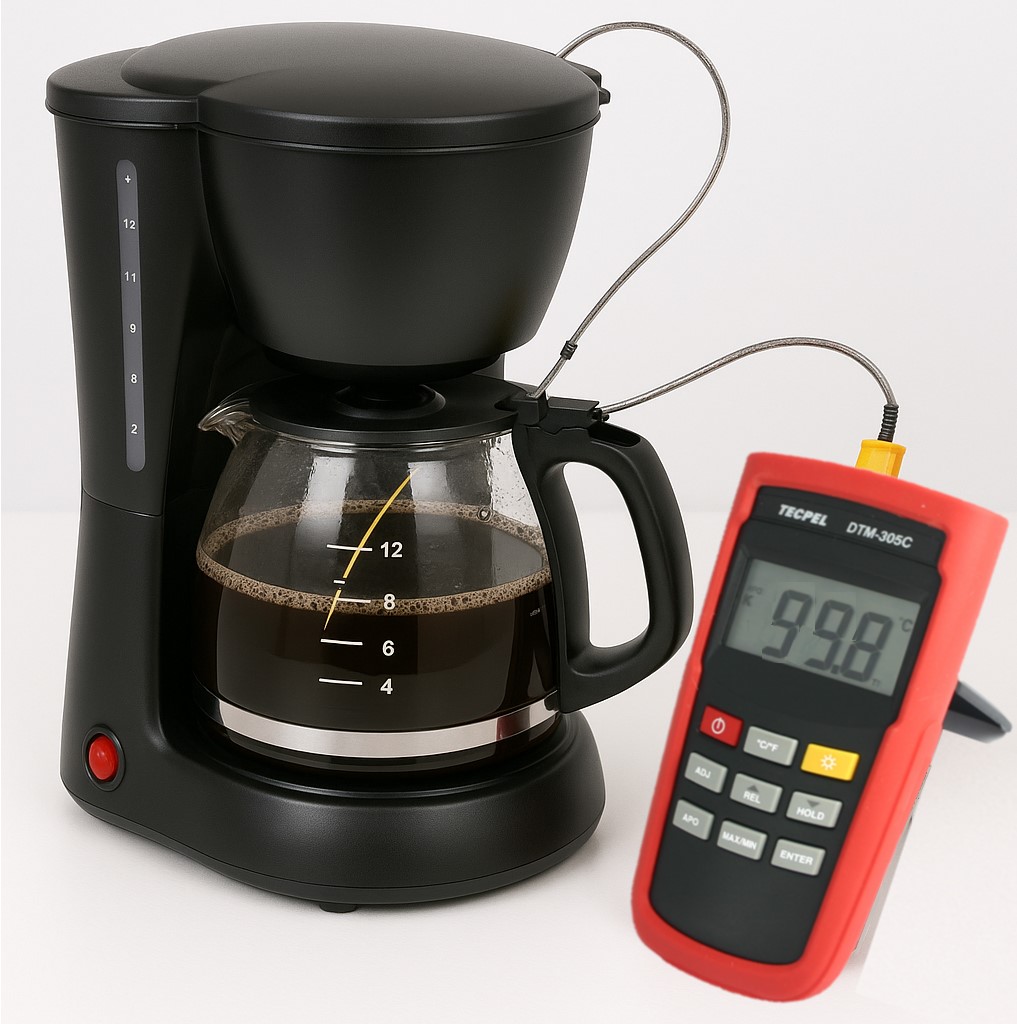 DTM-305C 使用K型熱電偶測溫線/棒,設計上具有較大的顯示字幕,且可背光顯示,讓使用者更容易閱讀。適合學校教學與工廠產線使用。(圖示咖啡爐與選購溫度側線為使用示意圖不含在此產品內,非實品)