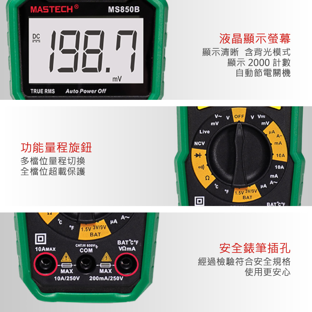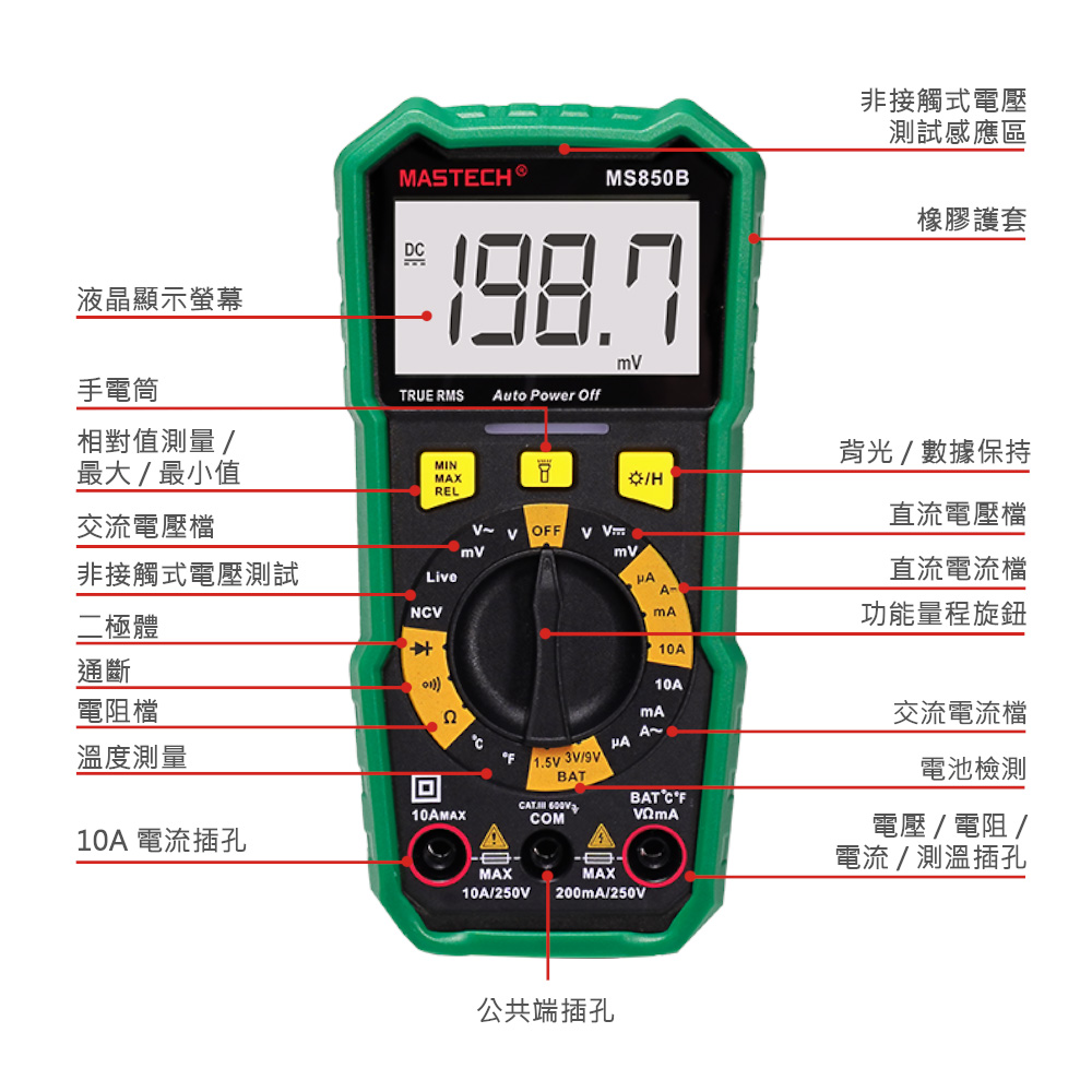 MASTECH MS850B 手動量程數位萬用電表,適合專業人士進行多種類型的電氣測量,如電壓、電流、電阻與溫度測量,應用廣泛。
